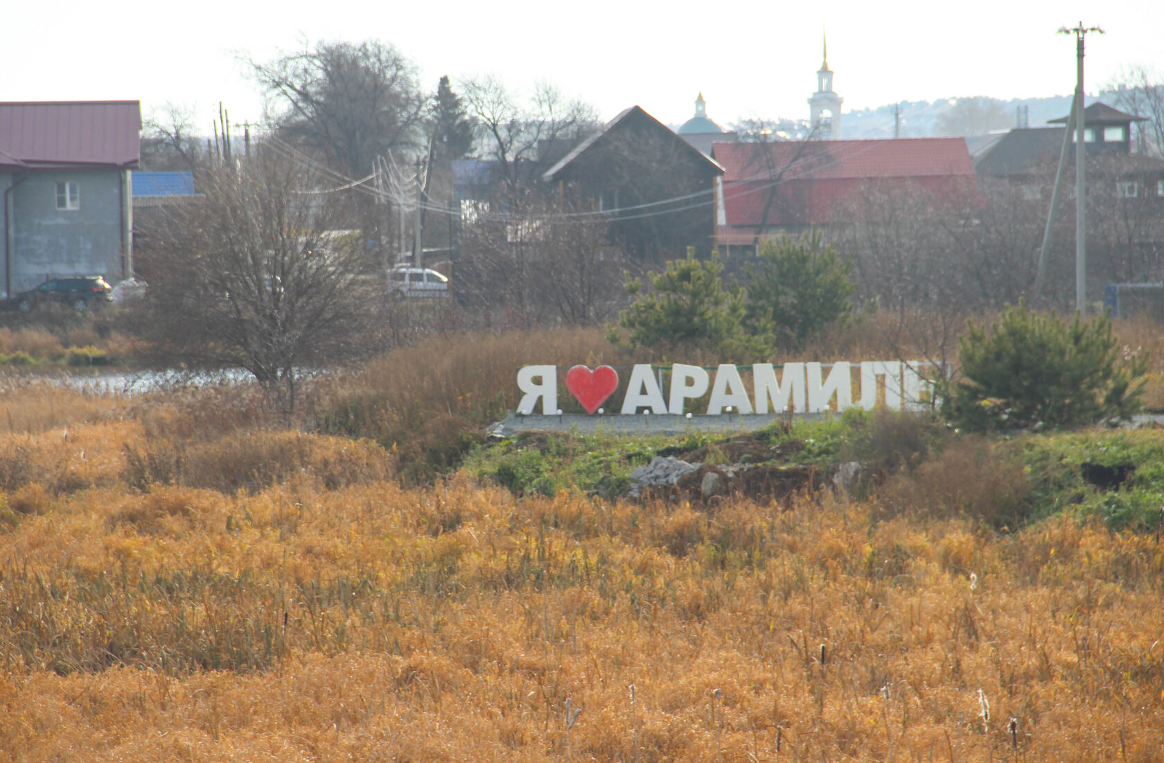 Пока арамильскую землю не успел окутать белым покрывалом снег, в кадр у нас попала уличная скульптура, появившаяся на выезде в сторону Екатеринбурга. Здесь все сделано по классике признаний в любви родному городу – чтобы надпись было хорошо видно с оживленной дороги.
