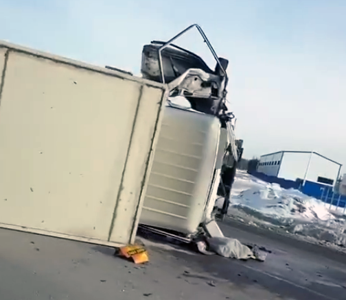 На въезде в Арамиль после жесткого ДТП перевернулся малотоннажный грузовик